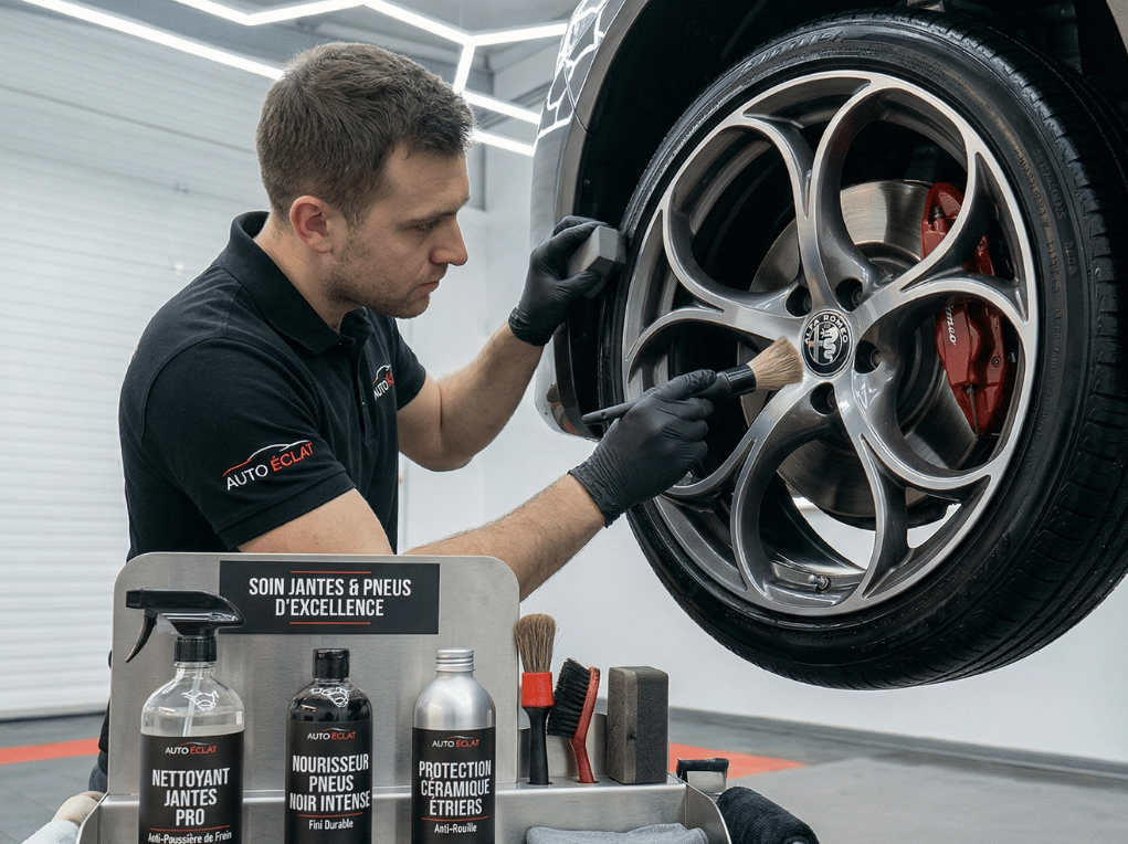 Un nettoyage minutieux en profondeur pour éliminer la poussière de frein la plus tenace, redonnant à vos jantes leur éclat d’origine et un noir intense à vos pneus.